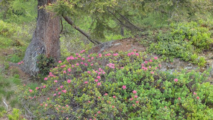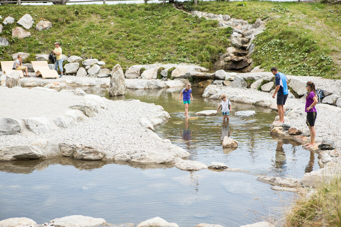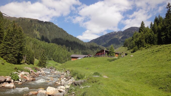 Continue along the brook, we reach the "Krummbachrast" - a hut with its own cheese factory and a big terrace. After a short refreshment we walk past to the bridge, where the trail climbs through a short forest section to the Nöckeltalalm. From the Arena Center (top station Isskogelbahn) and Latschenalm we follow a slightly ascending path of goods.