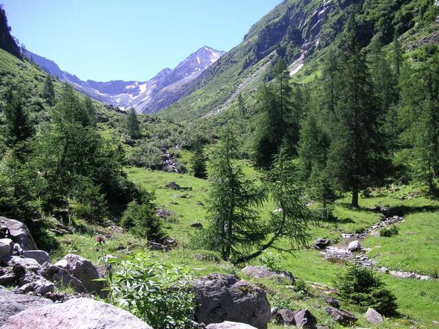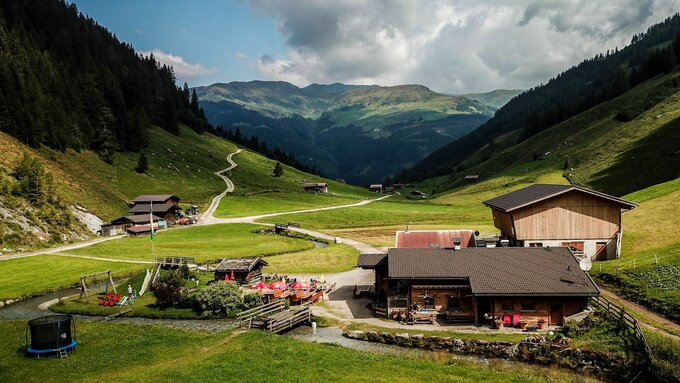 Opposite the Hotel Kröller (1,204 m) in Gerlos-Gmünd, hiking trail no. 6 starts in the Wimmertal with the lush green mountain pastures and the rushing Wimmerbach along the foothpath. After a short, somewhat steep ascent you will pass the snack station Klammer´s Jausenhütte (1.365m) an then finally, after half an hour of walking, you will reach the magnificently located at Wimmertalalm (1.375m). Fully restored, a further 300 altitude metres can then be tackled, even by less experienced hikers without any problems.