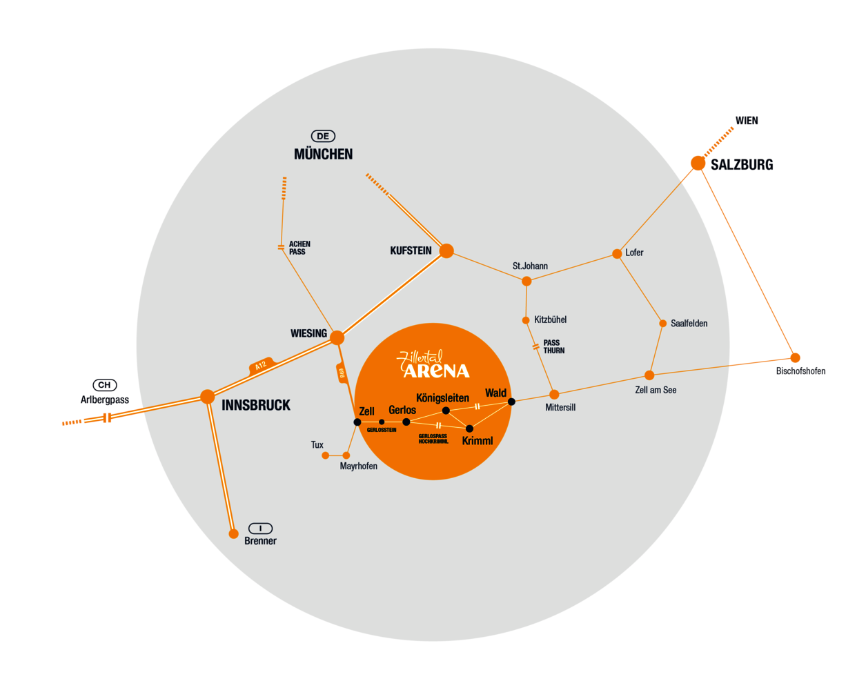 Die Flughäfen Innsbruck (50 km), München (170 km) und Salzburg (150 km) sind in unmittelbarer Nähe des Zillertals und Pinzgaus und durch tägliche Linienflüge direkt mit Destinationen in ganz Europa verbunden.