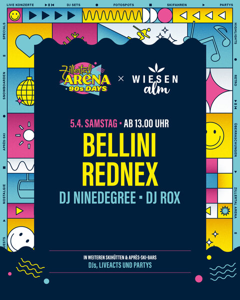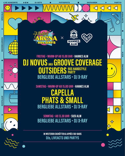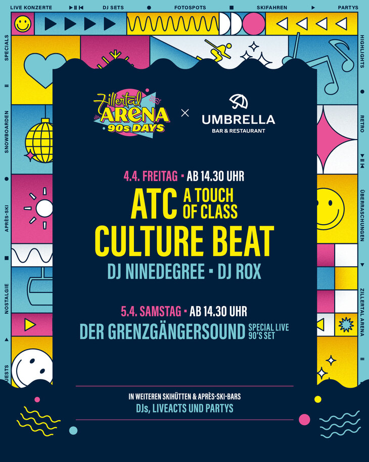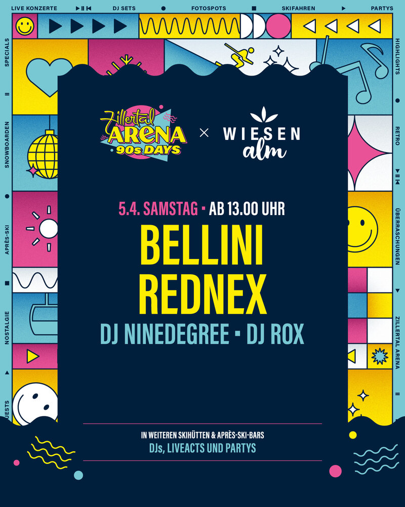 Vom 04. bis 06. April 2025 verwandelt sich die Zillertal Arena in eine Bühne für das legendäre Jahrzehnt der 90er Jahre! Ein Hauch von 90er Nostalgie in den Bergen: Das gesamte Skigebiet erstrahlt im Look & Feel der 90er, und mit Special Guests wird das Lebensgefühl dieser Ära wieder zum Leben erweckt. Bei den Arena 90s Days dürfen sich Gäste auf ein unvergleichliches Erlebnis freuen, das Nostalgie und Skivergnügen vereint. Neben den bekannten Live-Bands, die die größten Hits der 90er Jahre LIVE performen, sorgen DJs mit den angesagtesten Tracks für die perfekte Stimmung auf und abseits der Pisten.